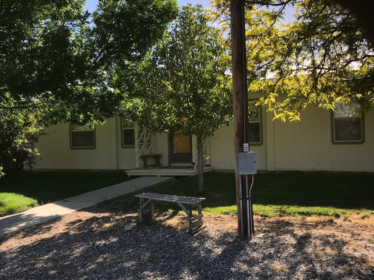 This farmhouse, built in 1948, is on a working, regenerative crop and cattle farm. It is near the dead end of a mile and a half dirt road. There are unobstructed views of the Bookcliff Mountain Range to the north and no other houses in sight. The house is surrounded with a spacious yard perfect for picnics and games. This is a very rural space only 10 minutes from downtown Fruita, and the 18 Rd. desert bike trails. Ask about having some farm raised grass finished beef to top off your stay!