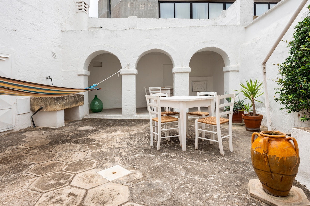 CIS: BR07401291000000188 CIN: IT074012B400033730 Vivi la magica sensazione di trovarti tra passato e presente: è una dimora storica! I pavimenti d'epoca e le pareti in pietra fanno da sfondo a un ambiente arredato con oggetti di design, vecchie ceramiche e mobili locali. L'ampio terrazzo privato, con solarium e doccia calda, saprà entusiasmarti: potrai rilassarti con un bicchiere di vino al tramonto, godere del sole su comodi lettini o preparare una cena in una magica atmosfera pugliese.