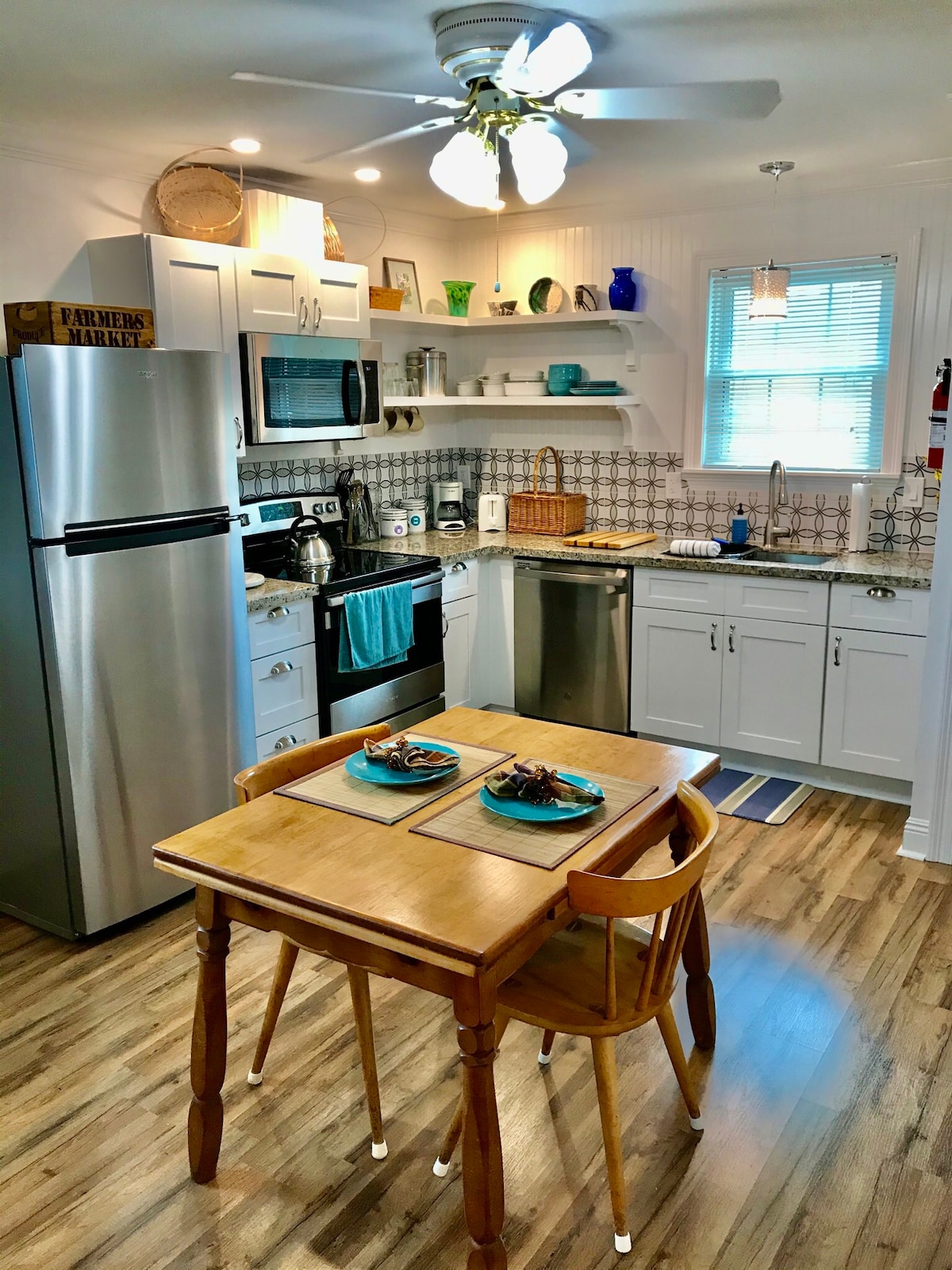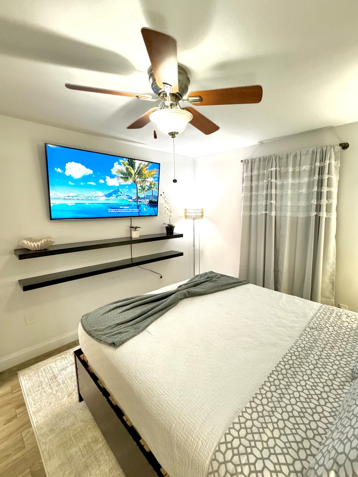 Clementine's Room is a lovely hideaway in Mid City on Bayou St. John. It is simply a bedroom/bath with tile shower, washer/dryer, and king bed. The door is next to a gazebo for outdoor time and the desk can be arranged for 2 to dine inside. There is a large Roku tv for streaming shows, a mini-fridge, microwave, electric kettle & coffee funnel for making morning coffee or tea, and dishes & flatware for heating up a snack. Also, it can be combined with our Sweet Suite for 2bed/2bath family booking