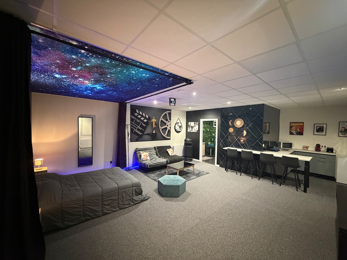 Profitez d’un grand écran de 2,5 m et d'un projecteur pour une immersion totale dans une ambiance cinéma À l’étage mezzanine, une chambre confortable pour 2 personnes Le salon est équipé d’un canapé-lit offrant un couchage pour 2 personnes Cuisine entièrement équipée pour votre confort Idéalement situé au cœur de Metz, à 2 minutes de la rue piétonne. La gare, le Centre Pompidou, la Cathédrale et les Arènes sont à 10 minutes à pied Stationnement payant dans la rue ou gratuit à 15 minutes à pied