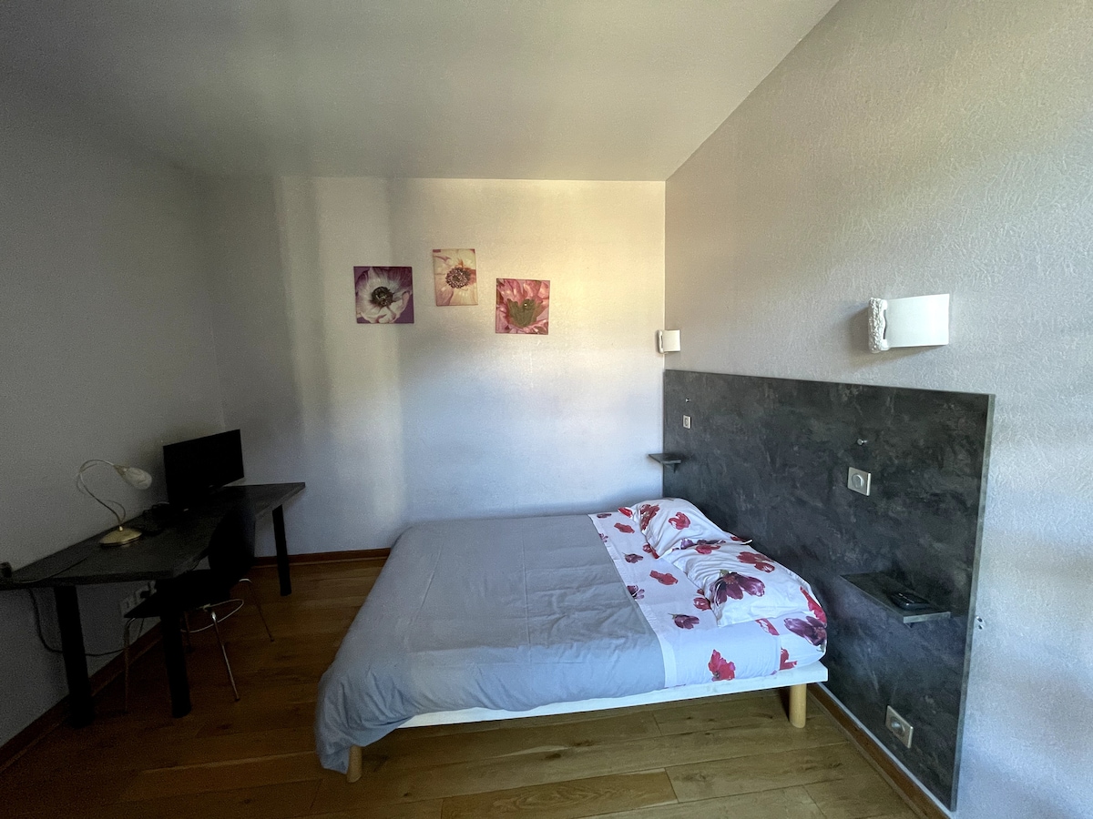 Le logement est situé près du centre, en face de la gare des cars et des navettes. La chambre est au 1er étage de mon appartement (duplex) situé au 4eme étage nord. Elle est équipée d'un lit en 140 de large x 190, d'une télévision, d une table avec 2 chaises et d'une salle de bains privée et W.C. individuel. Vous avez à disposition un micro-ondes, frigo, cafetière, bouilloire, grill pain, presse fruits, vaisselle. Ma cuisine située à mon niveau d'étage peut être utilisée exceptionnellement.
