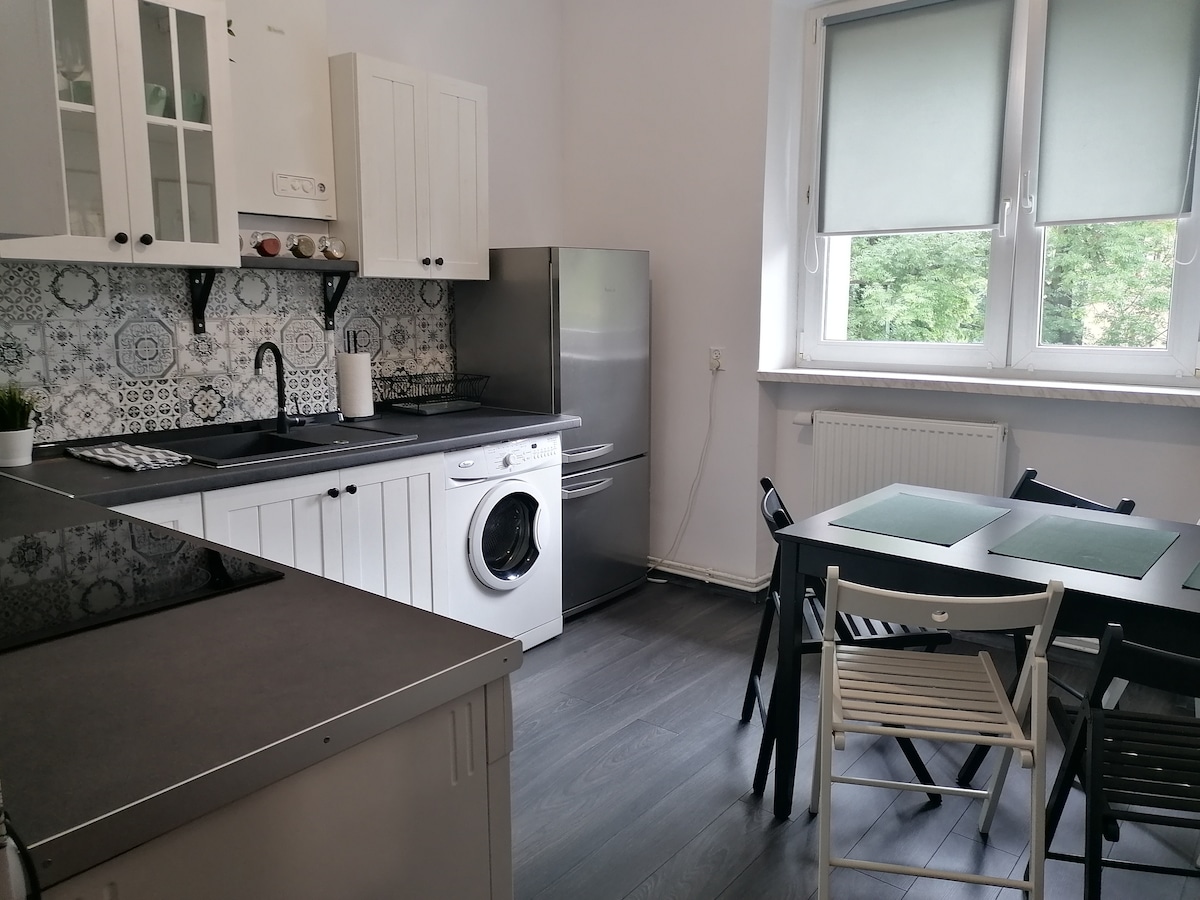 The apartment is located on the first floor of a renovated tenement house; in a quiet, green district of Bytom. Guests have access to: a spacious room with two beds and a place to work, a fully equipped kitchen with a dining room, a bathroom with a toilet and a hallway. Nearby there are shops and bus stops with direct connections to Tarnowskie Góry, Zabrze and Bytom. 5 minutes to the nearest entrance to the A1 motorway. 20 minutes to the airport in Katowice-Pyrzowice.