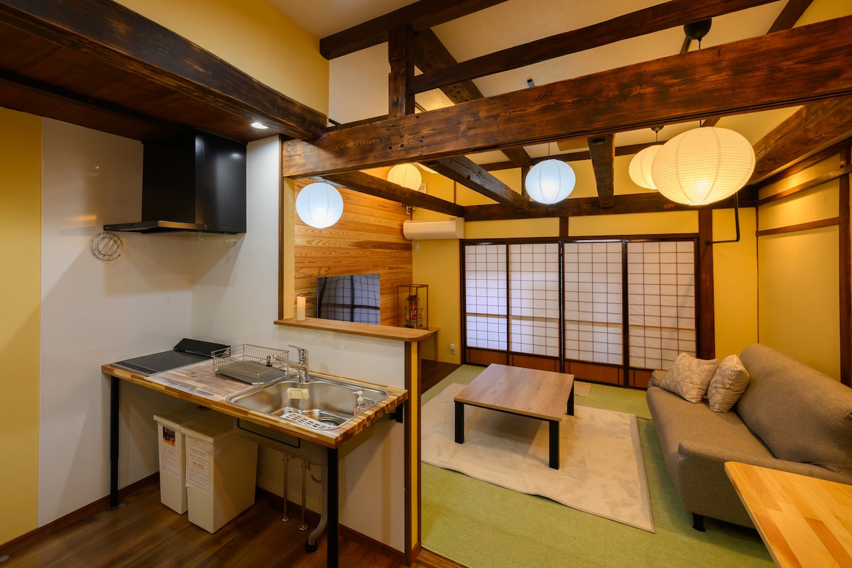 3-minute walk from the old town, house offers a comfortable space with a Hinoki bath, a modern Japanese style, fully equipped kitchen, tatami floors, and futon beds. Just a short 3-minute walk from the old town, yet it is very quiet, allowing for a relaxed stay. It is near the Higashiyama Walking Trail and temple districts, making it recommended to enjoy a stroll along these scenic routes. It is about a 15-minute walk from Takayama St, but you can enjoy the scenic view of the town as you walk.