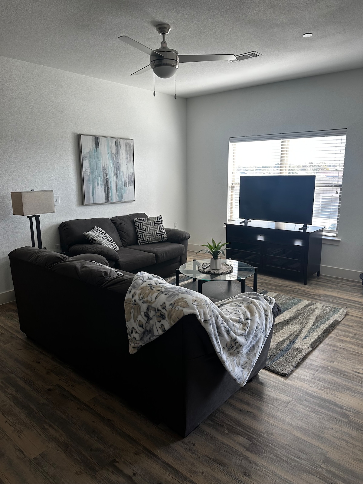 Spacious 1BR 1 bath with open floor plan for kitchen/dinning/living room. Our unit is newly renovated, and offers free Wi-Fi. new appliances, and microwave, fresh linens and towels, as well as extras located in closet with iron/ironing board. Bedroom has Queen bed , desk, and each room has Amazon Fire smart TV w/ remote to access multiple streaming apps. A small patio is located off living area where parking lot is clearly visible to see your vehicle. Laundry on-site short walk away.
