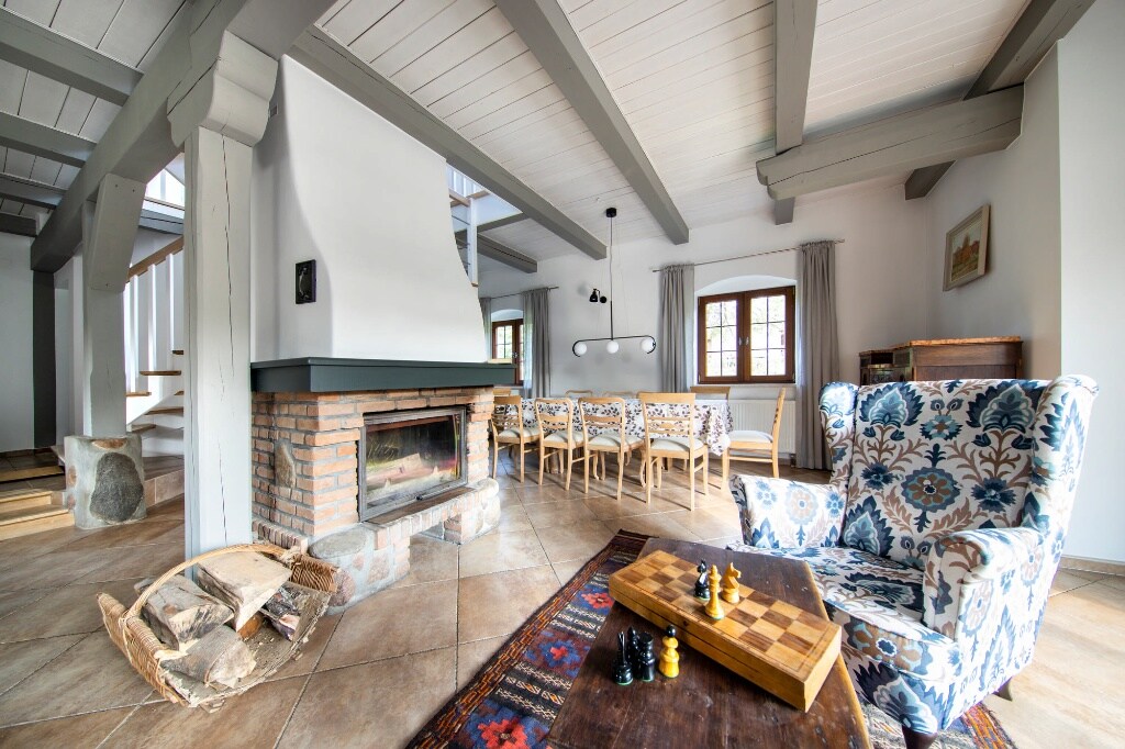 A two-story house with a terrace, garden, and stunning views of nature. 4 bedrooms, 3 bathrooms, 2 kitchens, and a spacious living room with a fireplace. All fresh and functionally furnished. The garden features a lawn, forest, a fireplace, a grill, loungers, hammocks, and a swing. The perfect place for a family or friends to escape the hustle and bustle of the city. No neighbors on the immediate border. Forests, lakes, bike trails, and kayaking trails are nearby. No large parties allowed.