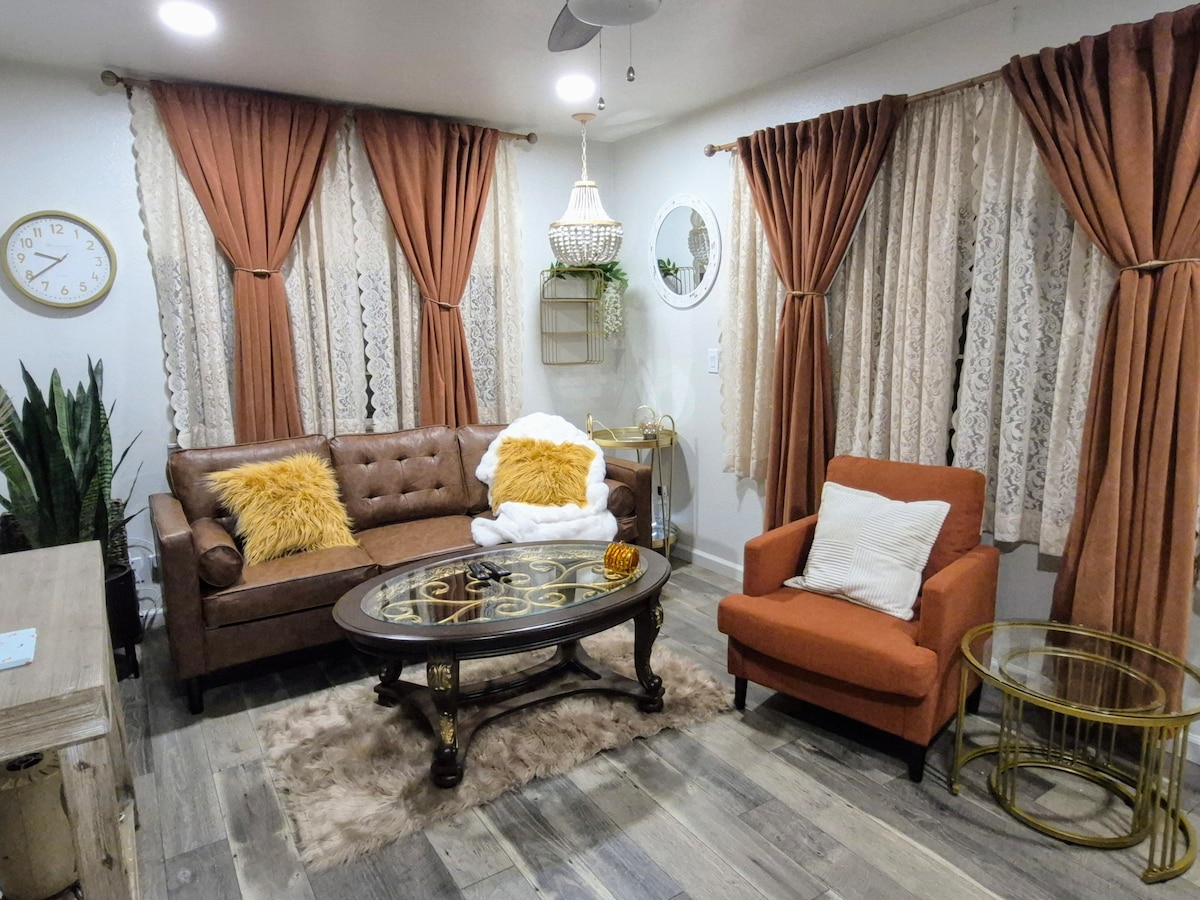 1 Large Bedroom -Vaulted Ceilings -HugeWalkIn Closet. Clean Custom Built Home perfect for any couple or traveling workers. Drive up to 1- Car Garage. Laundry room entrance w. Solid Wood Doors & Cabs. New King Bed 10” Memory Foam Finest sheets & NeW down comforters. KING Bed CONVERTS to TwinXLs for traveling co-workers! New 50” TV & Sherwood Speakers. Original Art hangs throughout! Huge tile Kitchen w. dishwasher & Custom Cabs & every amenity for Cooking! 1 Service Dog, of Course Welcome.