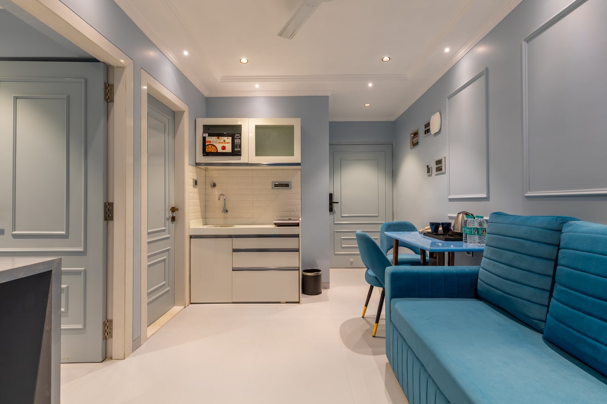 Beautiful one bedroom studio apartment offers the luxury home space with a king sized bed, attached washroom and separate fully equipped kitchen with dining area. The studio apartment includes amenities such as mini refrigerator, microwave oven, washing machine, induction cooktop, flat-screen TV, AC etc. Entire building is managed by professional hospitality company which will assure you more privacy and comfort during your stay.