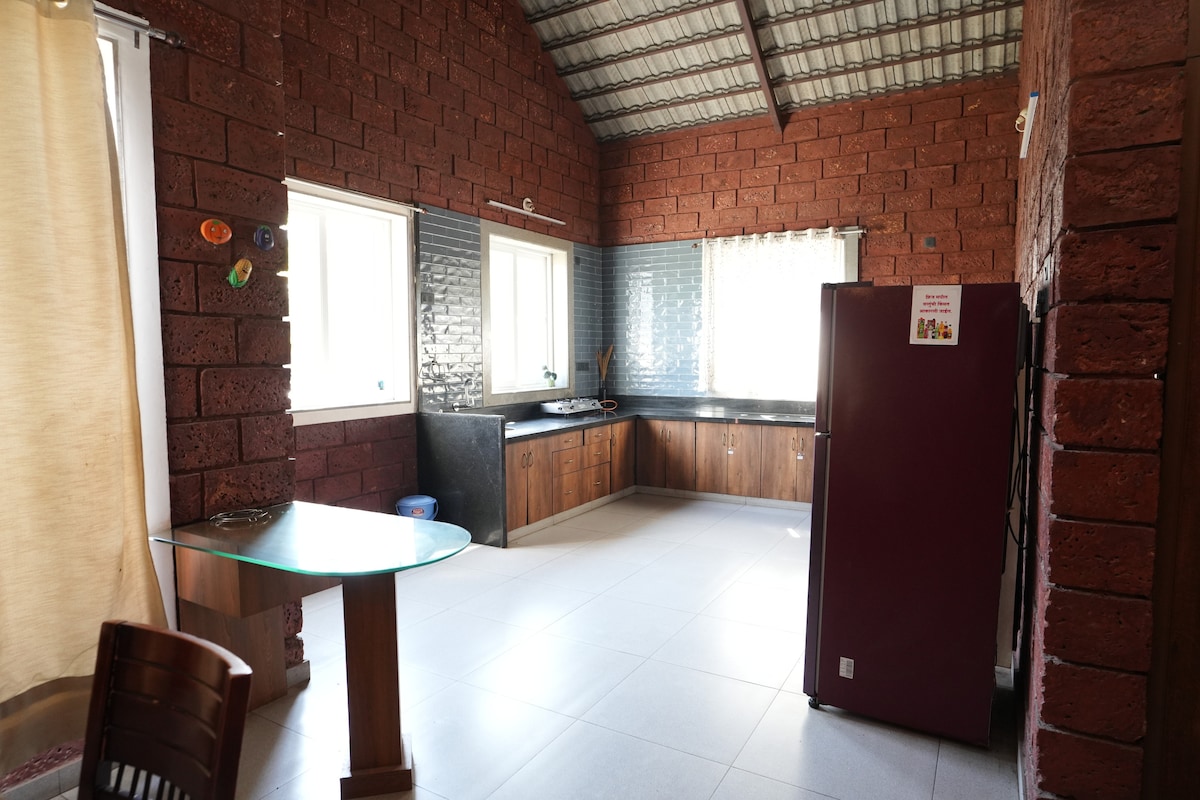 Tucked away in the serene landscapes of Sangli, this charming villa is a perfect blend of rustic elegance and modern comfort. Its red-tiled roof and brick-laden walls exude timeless charm, while the interiors mirror the same aesthetic with beautifully crafted brick design and tasteful decor. The spacious living room beckons you to unwind on plush sofas or challenge your loved ones to a game of chess or Monopoly.