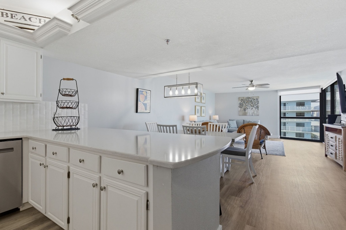 8th fl. stylish open studio w/stunning VIEW, beachfront in Sandestin Resort between Destin & 30A. 🛺 Golf cart with 5+ nts. NEW Pool & Hot Tub. West Elm furniture & King size bed w/ocean view. Sleek Kitchen w/dishwasher & Keurig. WiFi, 55” smart TV. Washer/dryer. Huge balcony to gaze @ the sea. Enjoy the beach, dining, shopping, trails, golf & entertainment all without leaving the resort. Tram pass & Gym. Perfect for honeymoon, baby moon, girls trip, solo travel or lil family vacay *NO animals