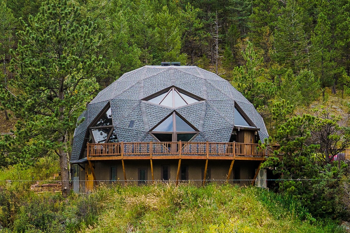 For the first time, you can stay at the legendary Estes Park Dome -- also known as the Snow Globe, the Golf Ball, and even the Death Star (22-ZONE3284). Our geodesic dome captures the imagination as soon as you lay eyes on it. + Eco-friendly rental w/ EV charger, heat pump & more + Deck w/ patio seating + Mins to Hermit Park and Lion's Gulch Trail + Fully stocked kitchen, games, stereo, TV, yoga mats, fast WiFi A whimsical retreat for 6, 10 mins from downtown Estes. Peep the 3d floor plans!
