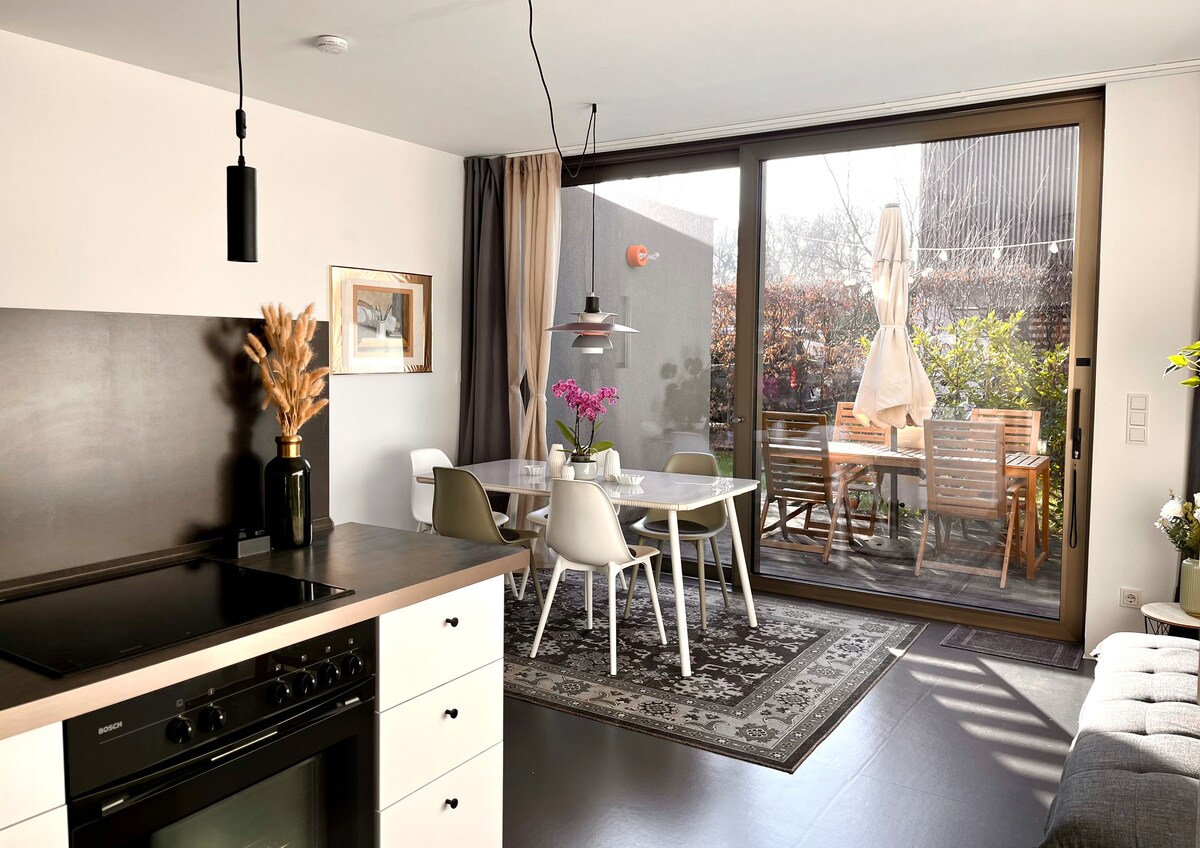Warm & quiet 40sqm apartment with private entrance in a Bauhaus-style townhouse. 🌡️ Underfloor heating fills the space with gentle warmth. Soft daylight from the 4m sliding window sets a calm mood. Step outside to the cozy Terrace for your first morning coffee, feeling the crisp air and peaceful garden around you. Perfect for slow mornings & cozy evenings. ⚡ Very fast WiFi · 👥 2 guests · 🍳 fully equipt Kitchen · 🧺 Washing Machine