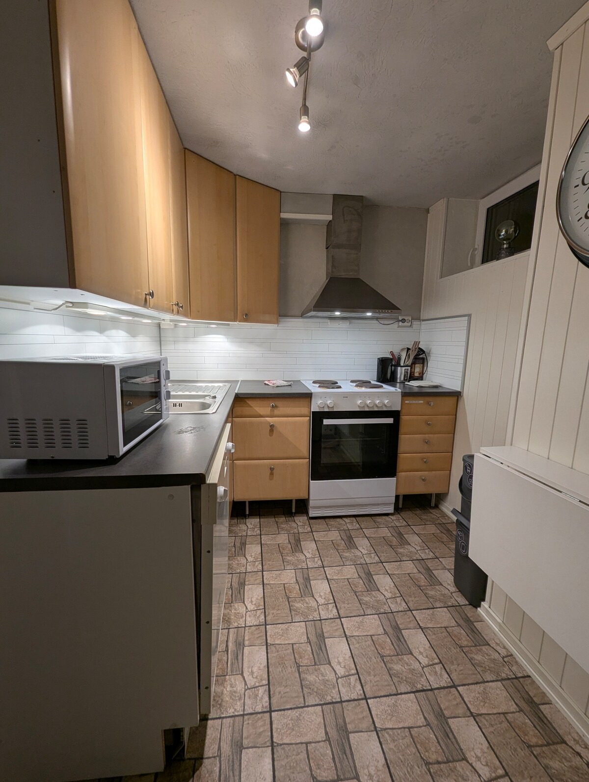 Cozy apartment with private parking, internet and private entrance. Heating in all floors. Living room with fireplace and chromecast. The bedroom has plenty of space, good storage facilities and a separate office area. 1 bed 150 cm and 1 bed 120 cm as well as a chair that can be turned into a bed of 80 cm. The kitchen is well equipped with fridge/freezer, stove, microwave and everything else you need.
