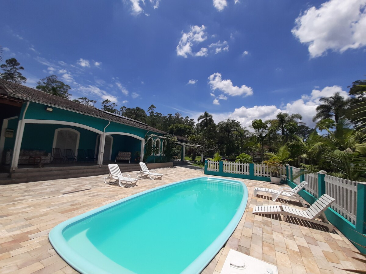 Family farm for hot and cold days. Located in Mogi das Cruzes near the Aruã condominium. Very close to São Paulo (less than an hour by Ayrton Senna or Dutra). 5000m² of total area, has a fireplace, swimming pool, barbecue area, court, playground. A place to relax, recharge, work from home, and have fun for all ages. Market, pizzeria, gas station, drugstore and bakery within a 5-minute drive. IMPORTANT: - Conscious use of water - Smoking in outdoor areas only
