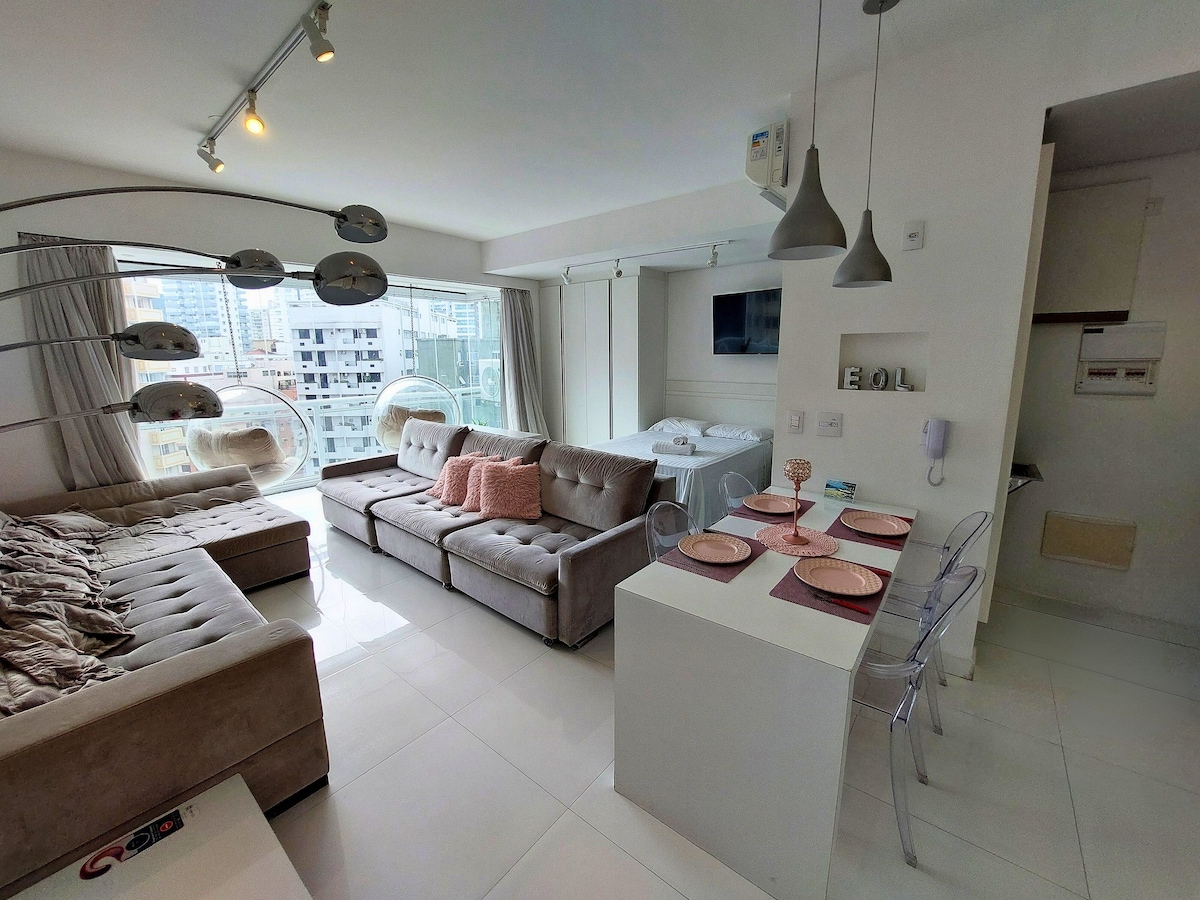 Relax in this calm and stylish space, made especially for couples of good taste, with EXCLUSIVE whirlpool with foam bath and swimming pool on the roof, with total security, amid the vast commerce with great restaurants, Brisamar shopping 5 min walk, Parking INCLUDED with valet, game room and the best 600 meters from Gonzaguinha beach. New apartment with incredible view, the best option for your honeymoon or romantic getaway.
