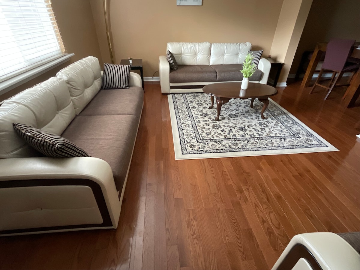 If you are looking for a quiet and convenient location in the Paoli area for a comfortable stay, welcome to East Central Ave. Close to shops, restaurants, walking trails, and the Paoli train station. This suite is a basement, but it has a private entrance, full bathroom and a patio. The kitchen has white cabinets with appliances, including a stove, an oven, a coffee maker, a toaster, kettle, and a refrigerator. Ideal for family of 5, 1 bedroom with a queen bed for 2 and 2 sofa cum beds for 3.