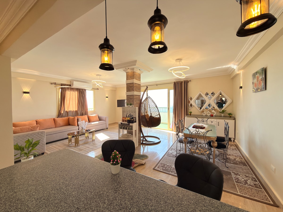 A distinguished apartment on the beach of Alexandria in the Montazah area. It consists of three bedrooms with 6 beds, two bathrooms, a large hall containing a dining room, a salon, and a living room. In addition to a sea view across the width of the hall. And a large balcony containing a sofa and chairs made of wicker and classic beads. The apartment is located on the ninth floor, giving it a unique view of the beach that you will never see before.