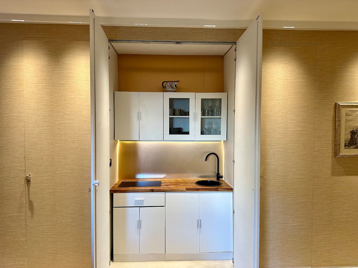 Nestled within a historic building facing one of the most iconic squares in the world, this one-bedroom apartment is located on the first floor and boasts modern amenities and an enviable patio, perfect for alfresco dinners. Ideal for couples or small families, the apartment features top-notch A/C system in all rooms, multi-room wireless sound system, steam bath as well as bathtub . Step outside the front door to toss your coin and immerse yourself in the lively atmosphere of the city center.