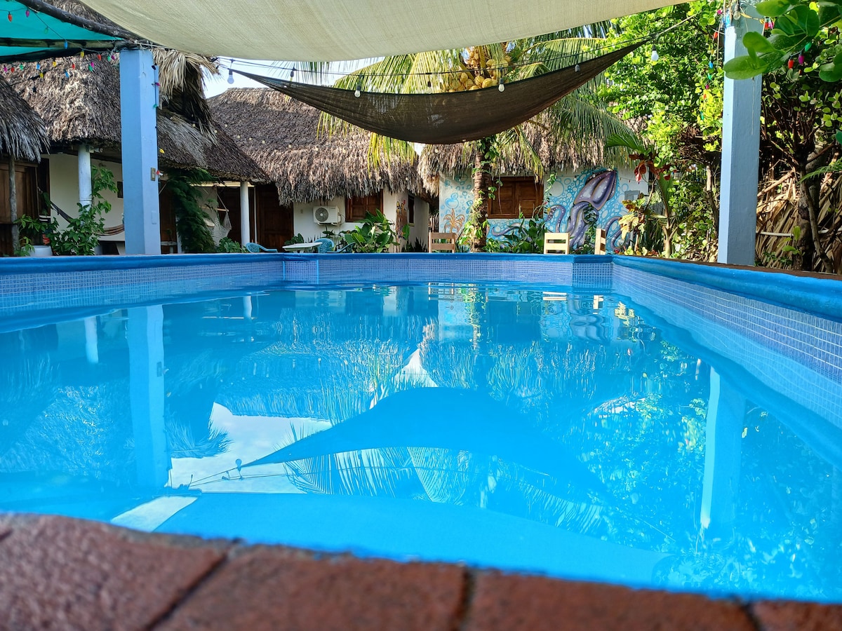 This Ocean access waterfront family & pet friendly home combines the best that Monterrico has to offer. Be part of amazing sunrises and peaceful sunsets with your family and the 4-leg furry best friend!! Enjoy a drink at the Tiki Ranch in front of the Ocean, or jump into the pool and Jacuzzi. The home has 3 bedrooms each with private bathroom and AC. You'll LOVE the dark sand beach, Tiki Ranch and outdoor grilling!! Take a walk to Tortugario, El Gariton and free your own turtle into the Ocean!!