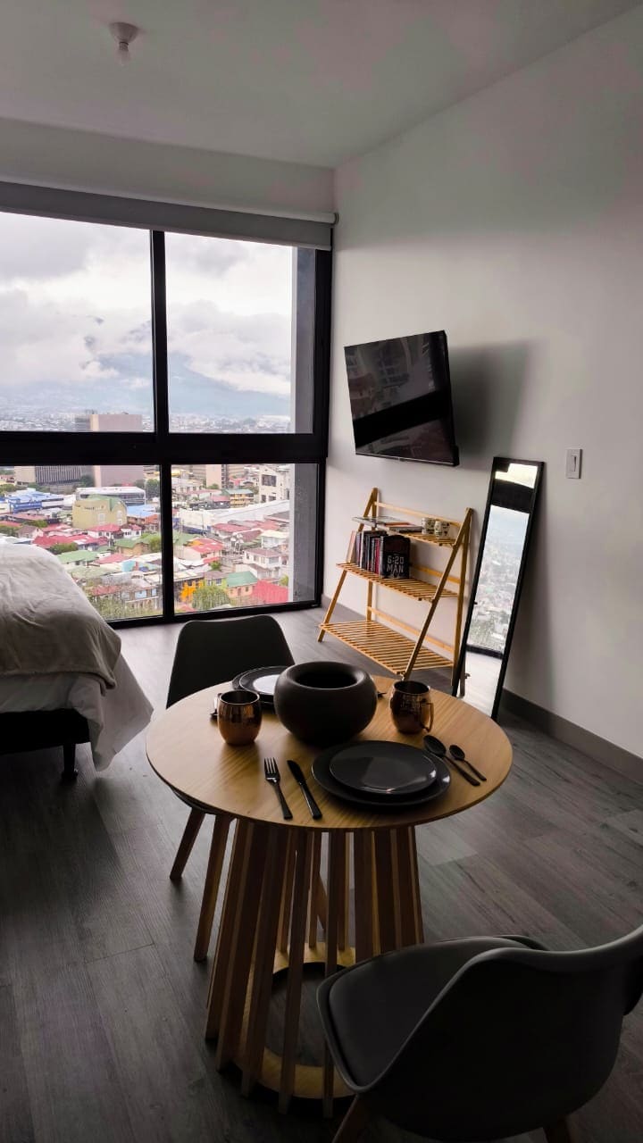Lets chat for a FREE early check in 24/7 security, ONLY building to park a PICK-UP Get up in the morning to the most magnificent view of Irazú Volcano, enjoying a cup of the most amazing costarican gourmet coffee. Get on to the amenities to enjoy a relaxing session in the Sauna or Hot Tub, put in a day of work then go out for a 2 minute walk to a delicious restaurant finally back home a comfy queen bed will welcome you. Tons of public transport available including a small train station.