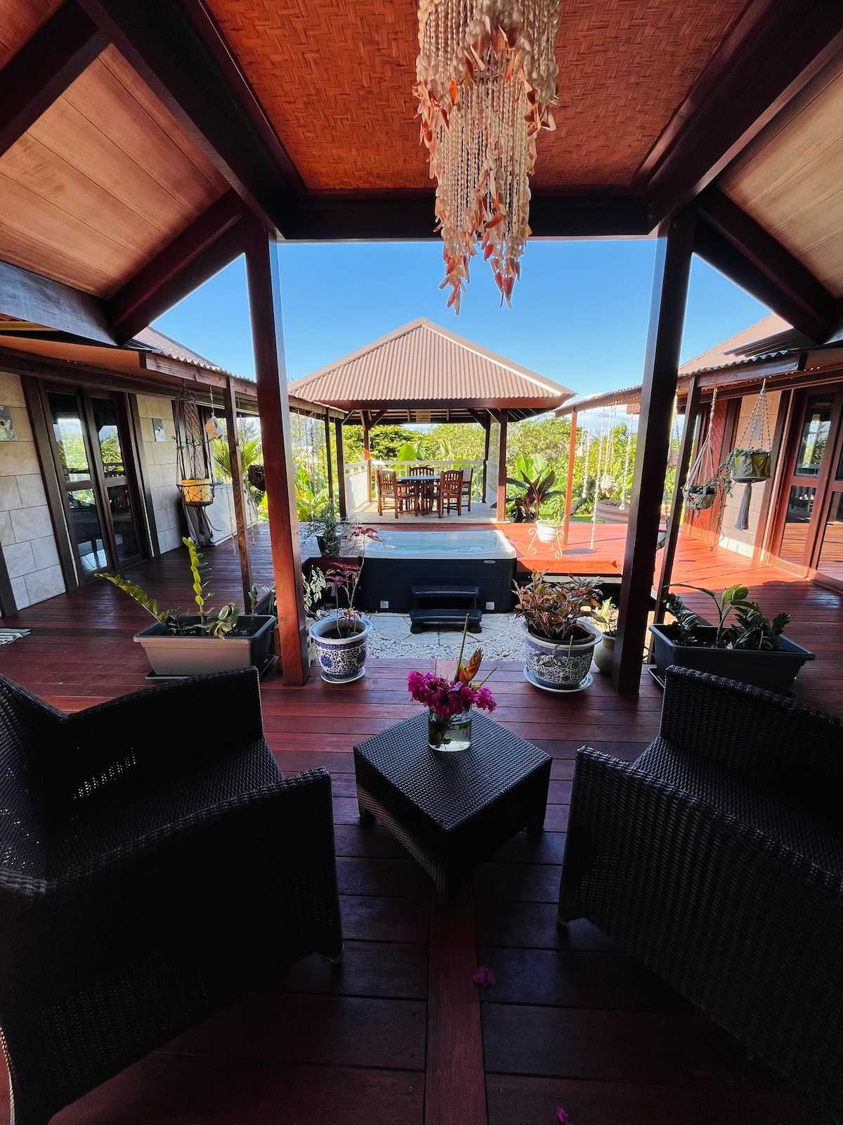 Private home on hillside overlooking Opunohu Bay Two Bedroom 1.5 Bathroom Fully equipped kitchen renovated in 2025 Living room Wrap around deck with patio furniture and 2 loungers Bbq Washer and Dryer Home is ideal for couples, solo adventurers, business travelers, and families. **Moorea charges a city tax of .60xpf per PERSON per NIGHT. This is not part of the nightly rate and will need to be collected in cash upon arrival**