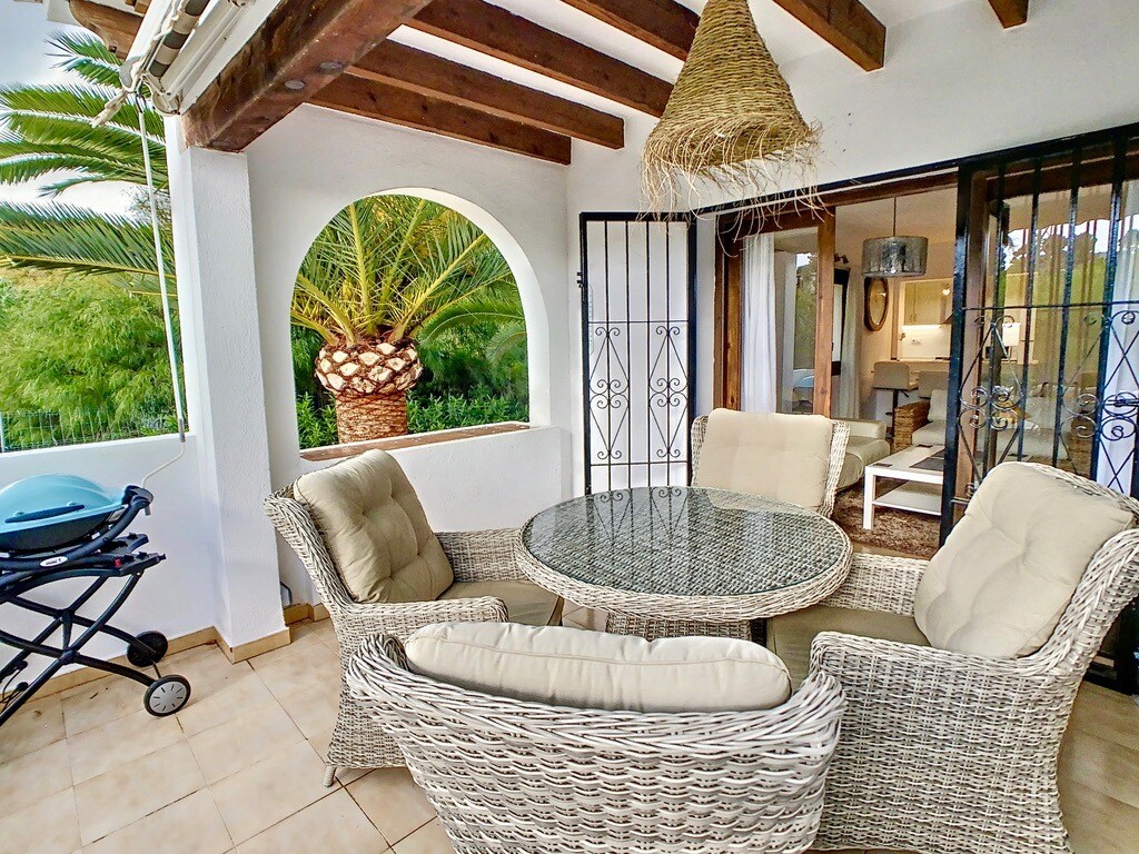 Cozy apartment with garden between the coastal towns of Moraira and Calpe. The studio was completely renovated in 2022 and now our guests also have a beautiful eat-in kitchen with dining area and couch at their disposal. A Mediterranean covered terrace with garden and BBQ with Gas completes the whole thing. It is about a 15-minute walk to the nearest beach. A tennis court with sports facilities such as paddle tennis, yoga and Pilates is in the immediate vicinity.
