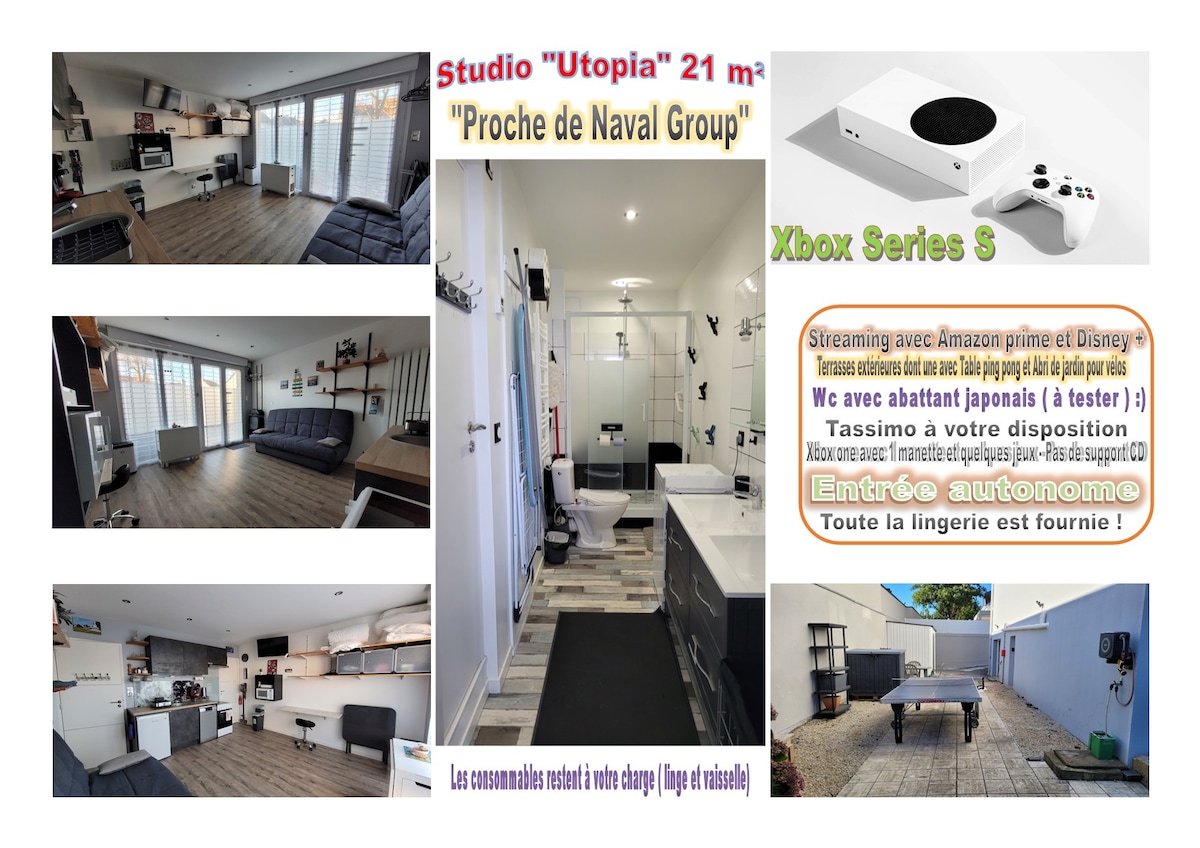 Private and independent studio, self-check-in and check-out 24/7. Free street parking Accommodation near a super U, landscaped park 2 minutes' walk and beach 10 minutes' walk. The accommodation is 2 minutes from the Hélice bus stop that serves the train station. Mezzanine with a double bed (sheets provided) Bathroom (towels/shower gel/shampoo) Folding bed available for 3rd travelers Kitchen with all the essentials + condiments. Coffee, tea, cookies Living room overlooking the terrace.