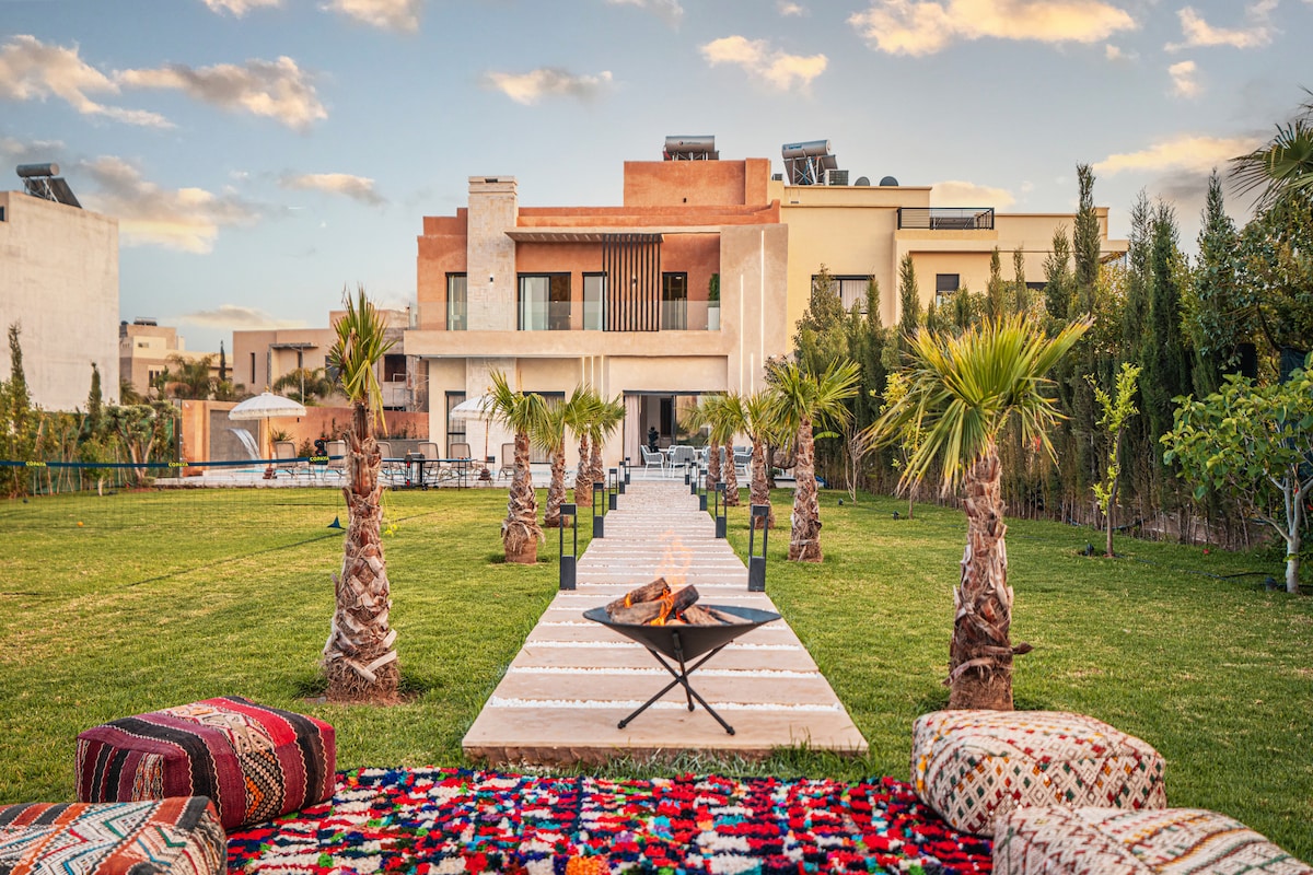 Privatisation complète jusqu’à 22 pers. Villa de luxe sans vis à vis, avec grande piscine chauffée à débordement & jacuzzi. 6 grandes suites climatisées & chauffées avec TV, minibar, café, etc... Idéale pour séjours & petits événements : avec danseuses orientales, musiciens, cracheur de feu & +. Services premium : ménage quotidien, serveurs, majordome. Billard, Mini-foot, basket, ping-pong... Coach sportif. Excellente cuisine marocaine. Transfert aéroport offert (1 vol). Tous transports 24/24