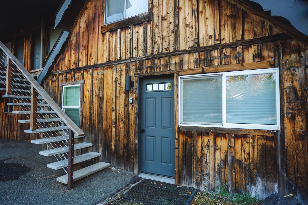 This is the back door unit up the stairs. It's uber cool and is one of the Stone Houses found around Mt. Shasta. The house maintains the exterior historic charm of the original house, but the inside is freshly renovated, stylish, spacious, and fabulous! The unit offers privacy for groups that may want some separation as one bedroom and bathroom are downstairs and the living area and another bed/bath are upstairs. This unit is accessed from the back door, completely separate from the front unit.