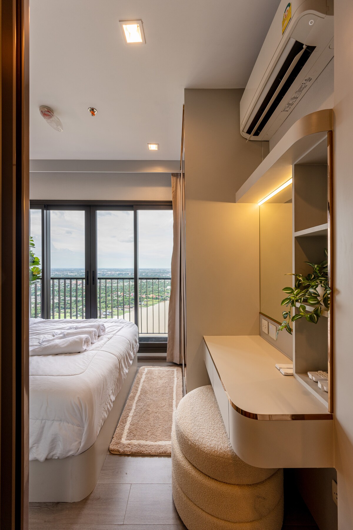 A Spectacular Cozy condominium next to Chao Phraya River a very high floor with a view of Bangkok skyline from bed and patio .. There are lot of sunlight comes in the room through out the day with lot of energy and good vibes 🤍 Facilities upto 3 huge swimming pools with the signature infinity sky pool on 56th floor with stunning river and sunset view, there is a clubhouse with games room, Co-working space infront of river as well with 360 degree view of Bangkok :)