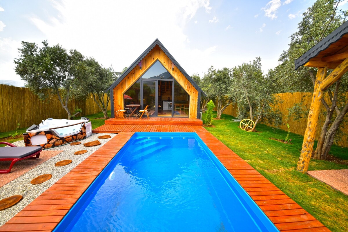A fully detached house with a large garden, pool and mezzanine floor among fig trees. Our house has 2 double beds, one of which is on the mezzanine floor, and a corner sofa that can be opened in the open kitchen. It can accommodate up to 5 people. There are all the kitchen utensils that may be needed in the kitchen and a barbecue in the garden where we can enjoy barbecuing. It is 10 km from the city center. You can reach all beaches in 5 to 35 minutes by car.