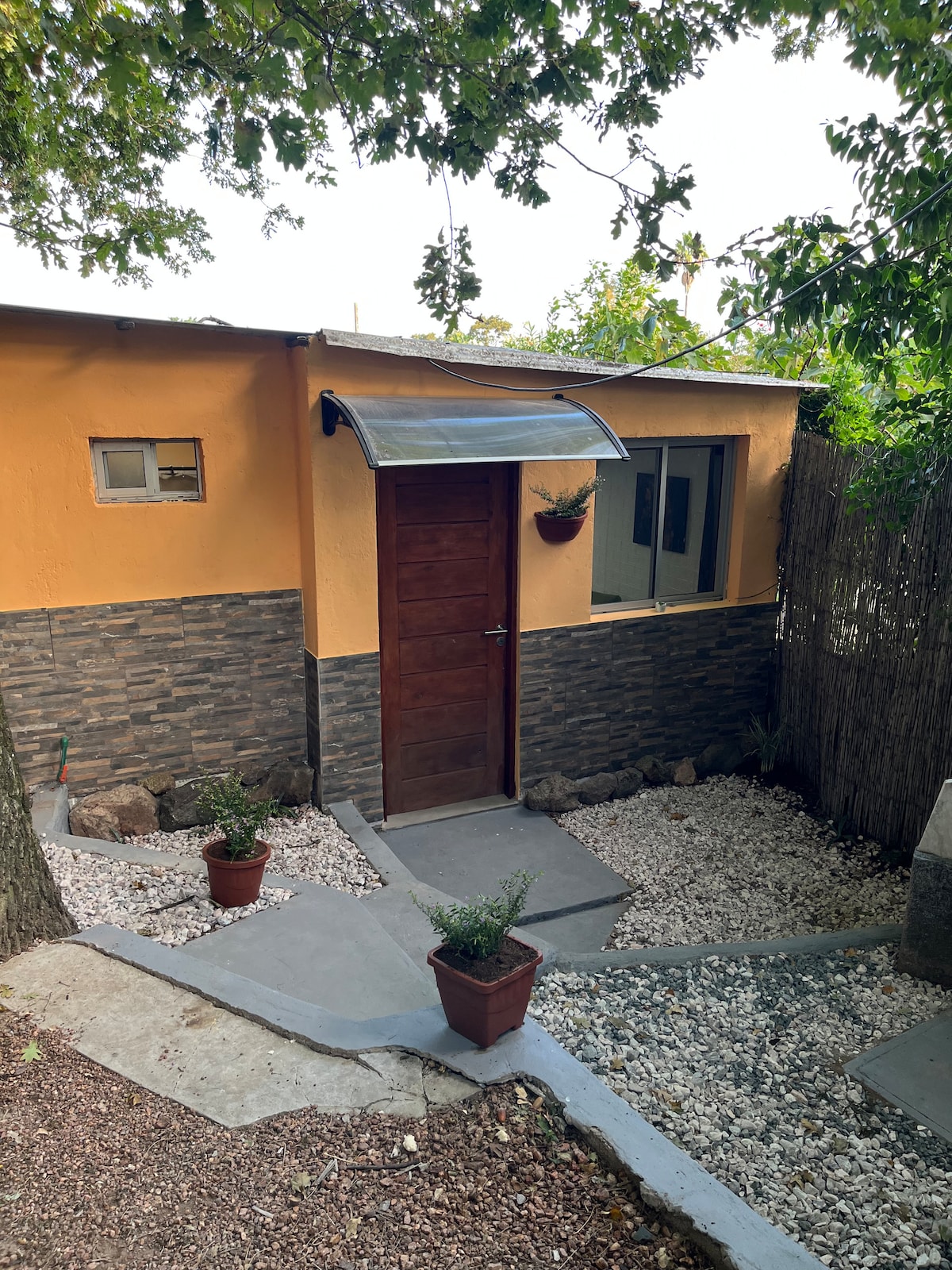 Monoambiente privado al fondo, con entrada independiente, en ambiente familiar y tranquilo. Para 2 personas adultas y (hasta 4 con colchón inflable). Cuenta con cocina equipada, ropa de cama y de baño en opción , baño, aire acondicionado y TV. Ubicación práctica: 5 min del Aeropuerto de Carrasco 800 m de Almenara Mall shopping 2.5 km de Costa Urbana Shopping 2 km de Playa Lagomar Estacionamiento en la calle. Espacio para colgar ropa. Ideal para estadías cortas o largas