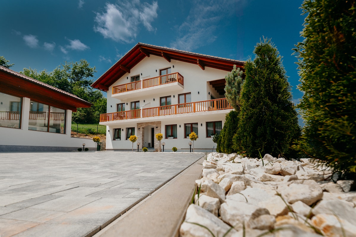 Cozy and modern 10 bedroom villa with shared kitchen and shared dining room close to hospital in a peace oasis in the city of Târgu Mureș, which we hope will help you find the calm and positive thoughts through the accommodation services we offer you. Walking distance to local swimming pools and Medical University. 5 minute walk to bus stop.Free parking and wifi and 1500 sqm of garden. When you leave us, we want you to have your batteries charged, to be positive and have only good thoughts.