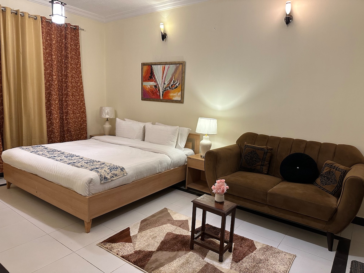 This stylish Studio apartment is equipped with luxury king size bed, Android TV, cozy bar, spacious kitchen, clean bathroom, air conditioning, Mountain facing balcony, loaded with all the amenities for a luxurious staycation. It's inside a secure and posh building with 24 hour service, free parking space, backup power and security. Features in-house tuc shop, BBQ, Bonfire and other facilities to make your stay all the more enjoyable.