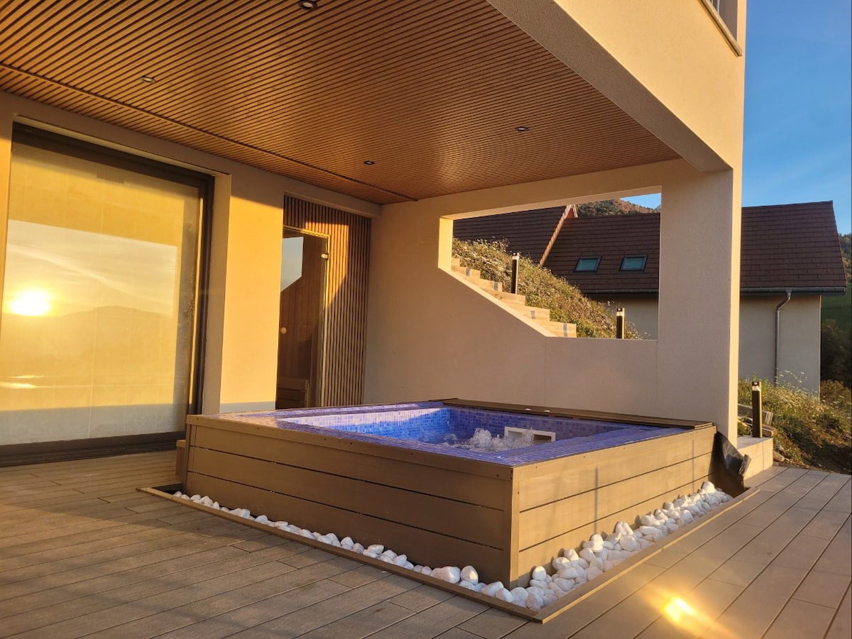 Treat yourself to a wellness break in this 60 m² apartment, located in La Combe-de-Lancey, between Chambéry and Grenoble. Its 40 m² private terrace invites you to relax with a mosaic jacuzzi for 4 people and a sauna, while enjoying panoramic views of the cities and mountains. The interior, with its Japanese touches, creates a Zen atmosphere, perfect for unwinding as a couple or with family. Booking possible for a family (4 to 5 people). For a group of friends, maximum 2 people.