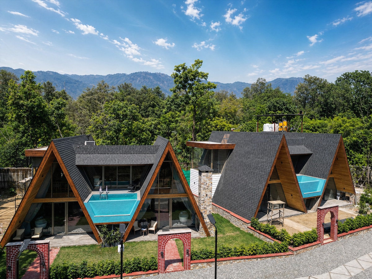 Retreat to a luxurious A-Frame cabin nestled within an amphitheatre of pristine forests on 3 acres of farmland estate in the Himalayan foothills. Wake up to musical birdsong in the densely wooded hillside bordering the property, sleep bathed in moonlight streaming through the magnificent twin skylights under starry nightsTastefully curated interiors, huge living spaces indoors & outdoors with the whole farm to explore, a bathtub for relaxing soaks and complete privacy from the outside world!