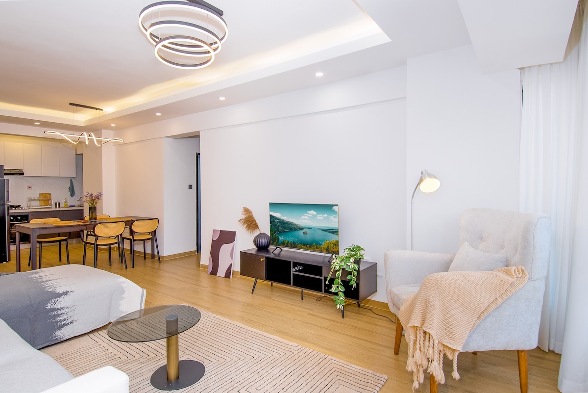 This entire stylish apartment is modern, spacious & comfortable, with one bedroom & en-suite bathroom, luxurious King size bed, eloquent dining room, bedroom & lounge Netflix-TV, balcony, kitchen and washing machine area. All amenities provided, including unlimited Fast WiFi and business facilities. Situated in a quiet leafy suburb, but also conveniently close to Westgate, Sarit and Lavington shopping malls, restaurants, business hubs, CBD and few meters walk away from Westlands nightlife.