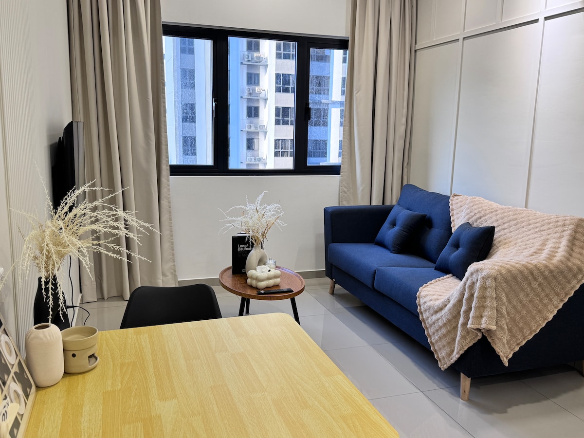 Definitely a cosy place with some Greece Santorini character in a heart of Damansara . Comes with 100Mbps WiFi and TV box (more than 3000 movies and dramas) The location is at Damansara Perdana which takes u around - 3-10 minutes to tesco,ikea,ikano, the curve and 1 utama shopping. - 15-20 minutes drive to Kuala Lumpur . There is covered parking and secured by security guard over the building. There is a DIY laundry at LG floor and also restaurants, bars, 7-eleven and others.