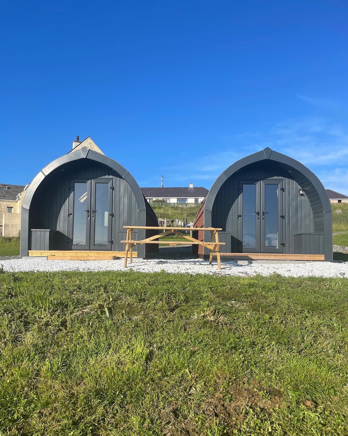 This is pod 2 and has an identical pod located beside it to the right which is pod 1. The Glamping Pods offer a bed, sofa bed, fully fitted kitchen and shower room. They can comfortably accommodate 3 adults. The pods are across the road from the Am Politician Public House and a 2 minute walk to local beach. The ferry terminal is a 5 minute drive however you can also get there by walking along the Bonnie Prince Charles Bay beach. The pods are warm and cosy, we hope you enjoy your stay with us.