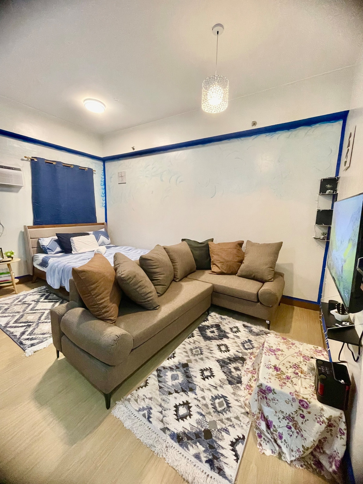 HappyStays#3 is an stylish ground floor, high-ceiling condo unit. It has a large loft increasing the effective area to 33sqm (versus 28.5sqm regular cut). On the lower floor of the loft is a queen bed and the top loft can accommodate 3 persons. Enjoy our 65 inches TV on super fast 300mbps wifi w/ NTFLX, HBO, PRIME & DISNEY. With complete kitchen & home appliances, including washer & electric water dispenser (w/ 3 round water gallons) for a homey convenience. It is located beside SM Mall.