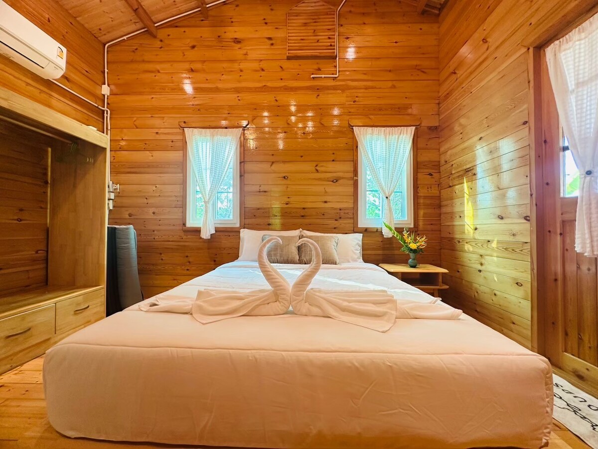 Private and peaceful cabin amidst coconut groves and tropical fruit trees. Surrounded by landscaped gardens and ponds, the area is filled with a variety of trees and flowers. Complete your holiday and relaxation atmosphere with indoor activities on such as boating, fruit picking, and outdoor BBQs, and there is also a communal kitchen for use. It is only 1.5 hours from Suvarnabhumi Airport.