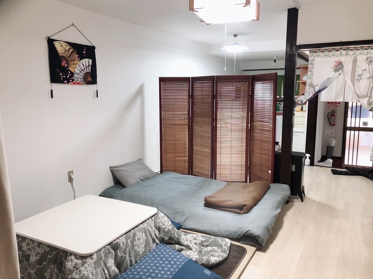 Introduction and features of the homestay Newly furnished, conveniently located in the heart of Osaka, surrounded by elegant and quiet Japanese temples, spacious tatami activity space, and well-equipped fire-fighting facilities. 1. Take the subway for 3 minutes to the famous Dotonbori Glico Sign. 2 stops to the whole street is Shinsaibashi. 2. About 12 minutes walk to Kuromon Market, convenient for medicine, cosmetics, shopping and food. 3. Although it is located in the center of Osaka, it is surrounded by temples, removing the noise of the city as if entering a secret place in the city 4. Newly furnished throughout, the 3 rooms are rented to one group of guests at a time to fully enjoy the private space, perfect for family travel and friends gathering. - Minimum 3 people, maximum 7 people - Wi-Fi Features: 1. About 2 minutes walk to Osaka's famous shrine "Ikuta Shrine" 2. About 12 minutes walk to Osaka tourist attractions "Kuromon Ichiba" 3. To the famous sightseeing spot Dotonbori Glico sign/take Sennichimae Line 2 stops and get off at Namba from 15-7. Exit B is a 4-minute walk, the whole street is the famous Kokura Bridge 4. To Abeno Harukas/Take the Tanimachi Line 1 stop and get off at Tennoji 5. About 14 minutes walk from the B&B to the famous food and shopping street in Uehonmachi (from B1 to 3rd floor there are restaurants from different countries, massage, clothing, etc.) 6. About 15 minutes walk from the B&B to Uehonmachi Kintetsu Department Store (cosmetics, clothing, sports center, food, restaurants, everything)