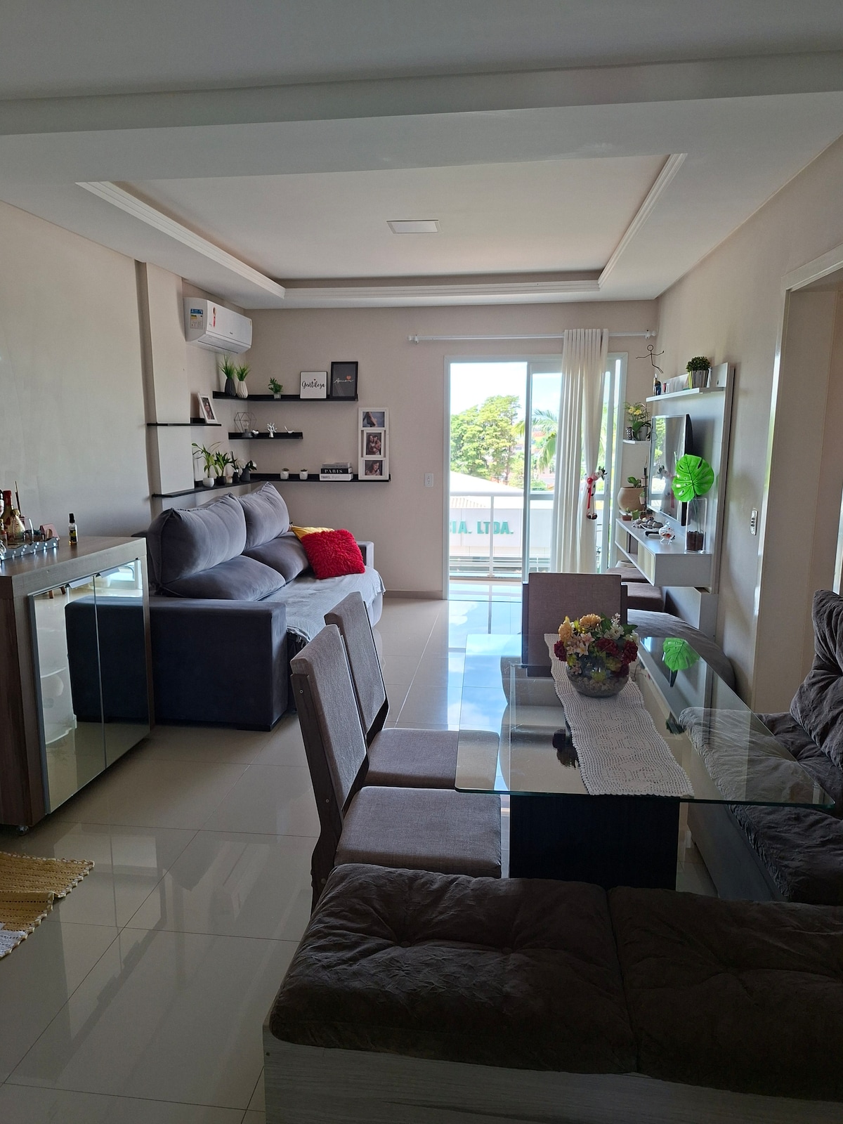 Enjoy an elegant experience in this well-located place. Modern, functional and cozy apartment. Indoor barbecue with complete utensils, custom furniture, next to bakery, pharmacy, butcher shop, restaurants, gas station and shops. Outdoor leisure area with terrace with immediate access from the apartment.