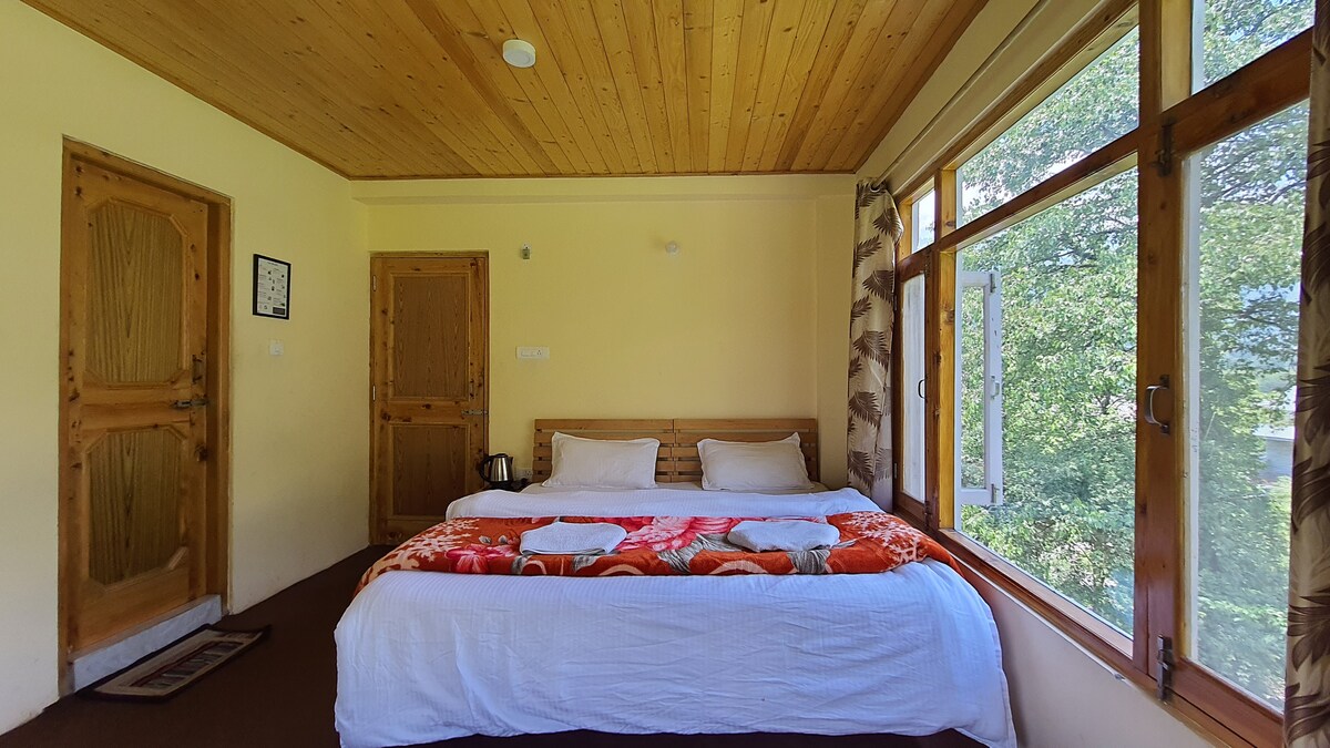 Rumsu Sunrise is our best Double Room. On the 2nd floor of the property it boasts of superb views of the valley and the surrounding apple orchards. It has an attached bathroom with running hot and cold water.