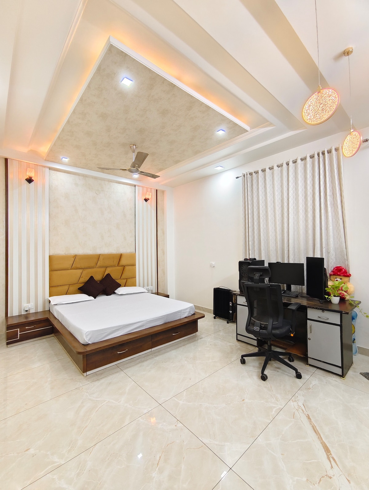 Welcome to our luxurious urban Studio, a sanctuary of style and sophistication in the vibrant heart of the Gurgaon. A standout feature of our loft is specialty Black color scheme, which adds a touch of elegance and drama to space, making your stay comfortable & stunning. As you step into our elegantly furnished Studio, you’ll be greeted by sight of our plush black recliners. These two luxurious recliners are the centerpiece, offering a perfect blend of contemporary design & exceptional comfort.