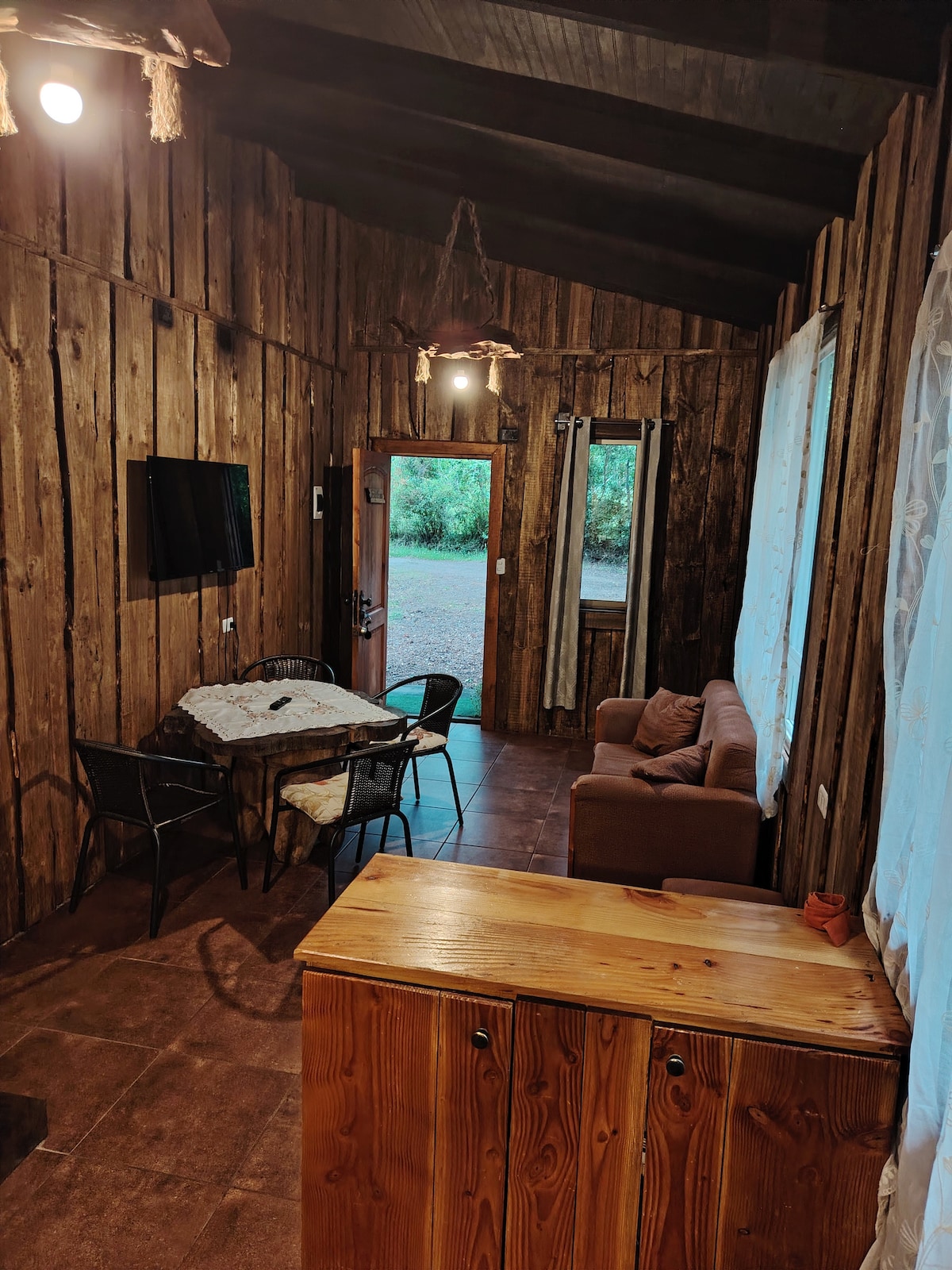 Cabin for 2 people in the Punahue Forest 5 km from Choshuenco, 10 km from Neltume and 15 km from Puerto Fuy, ideal for those seeking peace and nature. Close to beaches, rivers and Huilo Huilo Biological Reserve. Features a comfortable bed, equipped kitchen, private bathroom, TV, parking, terrace and grill. Intimate and quiet space to disconnect and enjoy. 📌 High season (January, February, holidays): we request presentation when booking. We are looking for guests who value and care for the place.