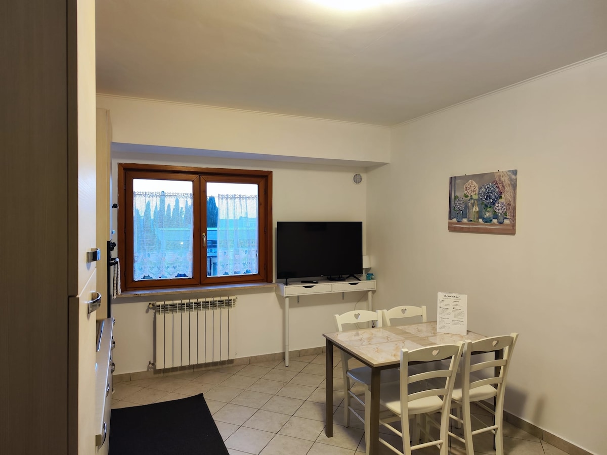 NEAR ROME The "Casetta del Borghetto" is located in the heart of the village on the 1st floor of a small condominium. Airport shuttle (for a fee) The apartment is suitable for couples and families. Double bedroom with standard bed, built-in wardrobe, chest of drawers and small desk. Living space with sofa bed, 1 or 2 seats, table with chairs and TV. Kitchen, with induction cooktop, fridge, microwave and washing machine. Bathroom with shower. Air conditioning. Outdoor terrace with table and chairs