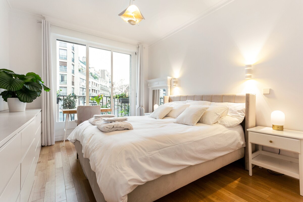 Elegant and spacious apartment close to the Champs Elysees, Arc de Triomphe & Trocadero. The apartment has been fully renovated by an architect, is equipped with AC and parking. It includes 3 bedrooms, 2 bathrooms, a large living room, dining area and fully equipped kitchen with balcony. You'll love our place thanks to the chic & special atmosphere, the brightness, the comfortable and quiet rooms and the lively neighborhood. We look forward to welcoming you for a very chic Parisian experience!