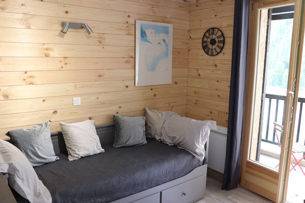 Time to recharge your batteries in the heart of the Clarée Valley. Studio for 4 people, completely renovated in the spring of 2020. Rated 2 stars, on the 1st floor, south-facing balcony with unobstructed view of the mountains. 1 mountain corner, bunk bed isolated by a door from the living room-kitchen, 1 bathroom with shower, washer-dryer, separate toilet. The kitchen area is fully equipped (oven, induction cooktop, range hood, dishwasher, 200 L fridge), living room with TV, Wi-Fi, pull-out sofa bed for 2 people.