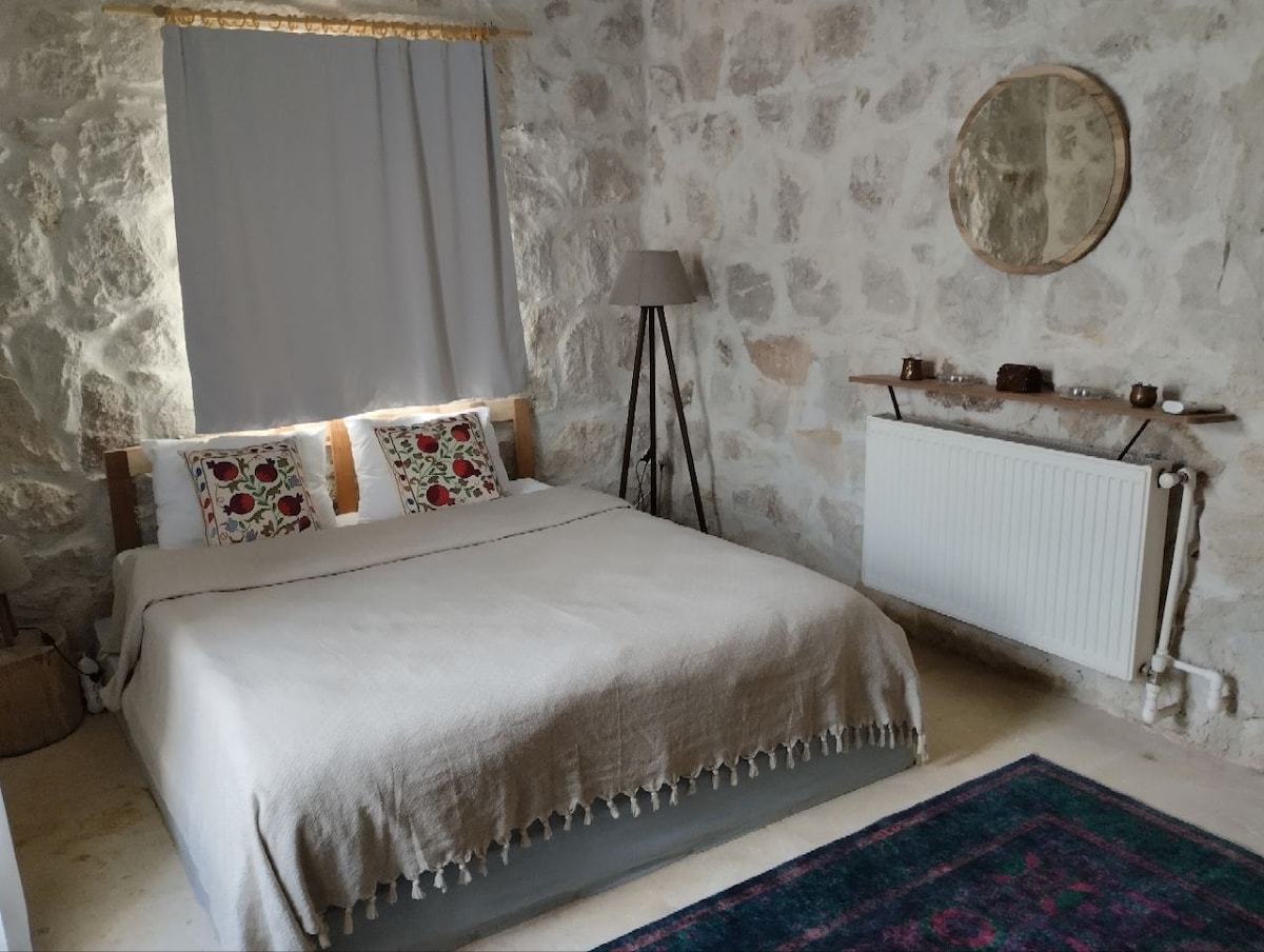 this recently renovated traditional Cappadocian house has three cave rooms with ensuite bathrooms opening to the patio, it has floor heating and great views over the valley and the old town, it's five minutes walk away from Balkan valley which is considered as one of the most beautiful valleys of Cappadocia.