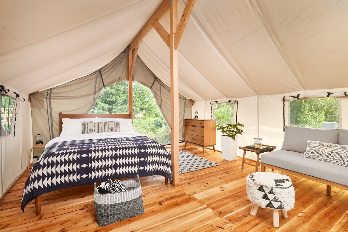 Embark on an off-grid luxury glamping adventure in the heart of Hudson Valley, discover one of Twin Island Lake’s private island with 360 degree views.. Reconnect with yourselves and nature in a Safari style tent furnished with a queen size bed. 13x10 gazebo with outdoor amenities. Park on the mainland next to the dock where a canoe awaits your arrival. This sweet escape is a once in a lifetime experience you will remember forever.